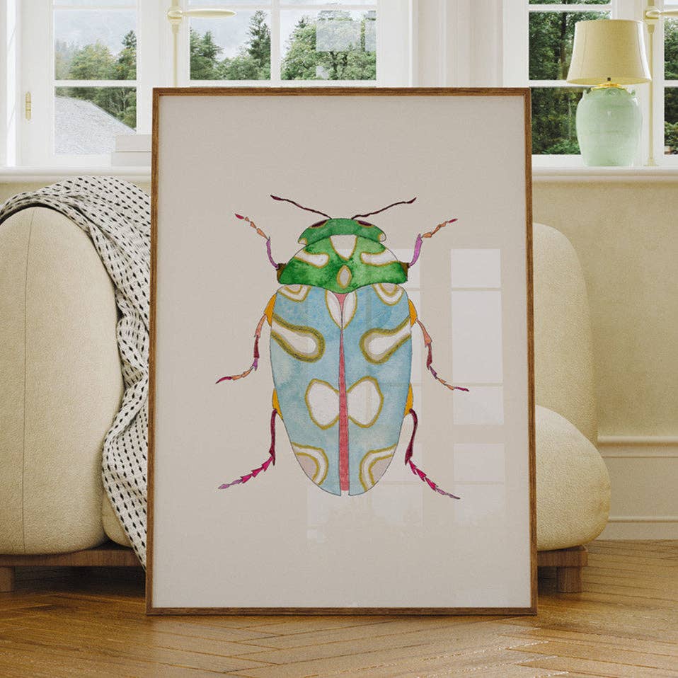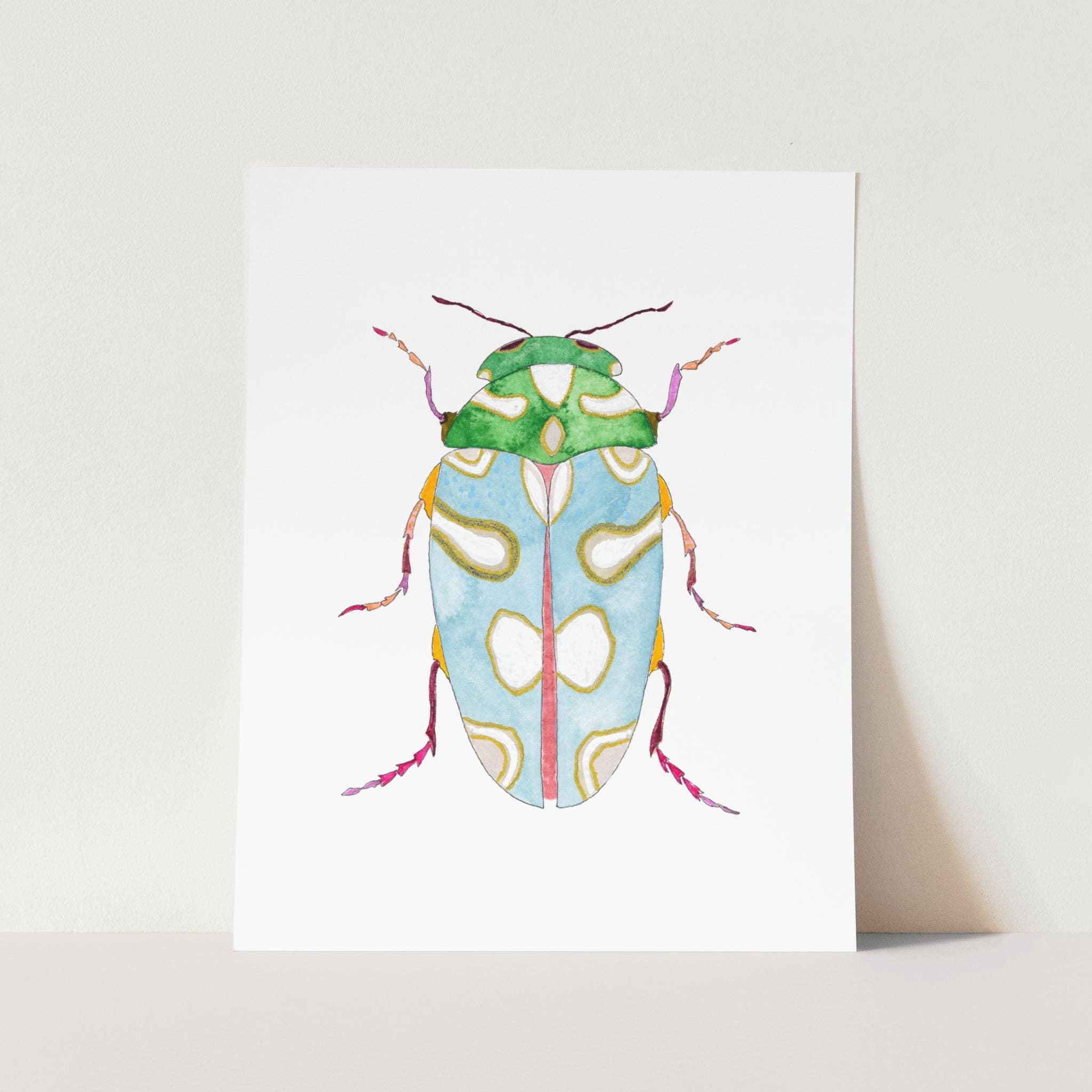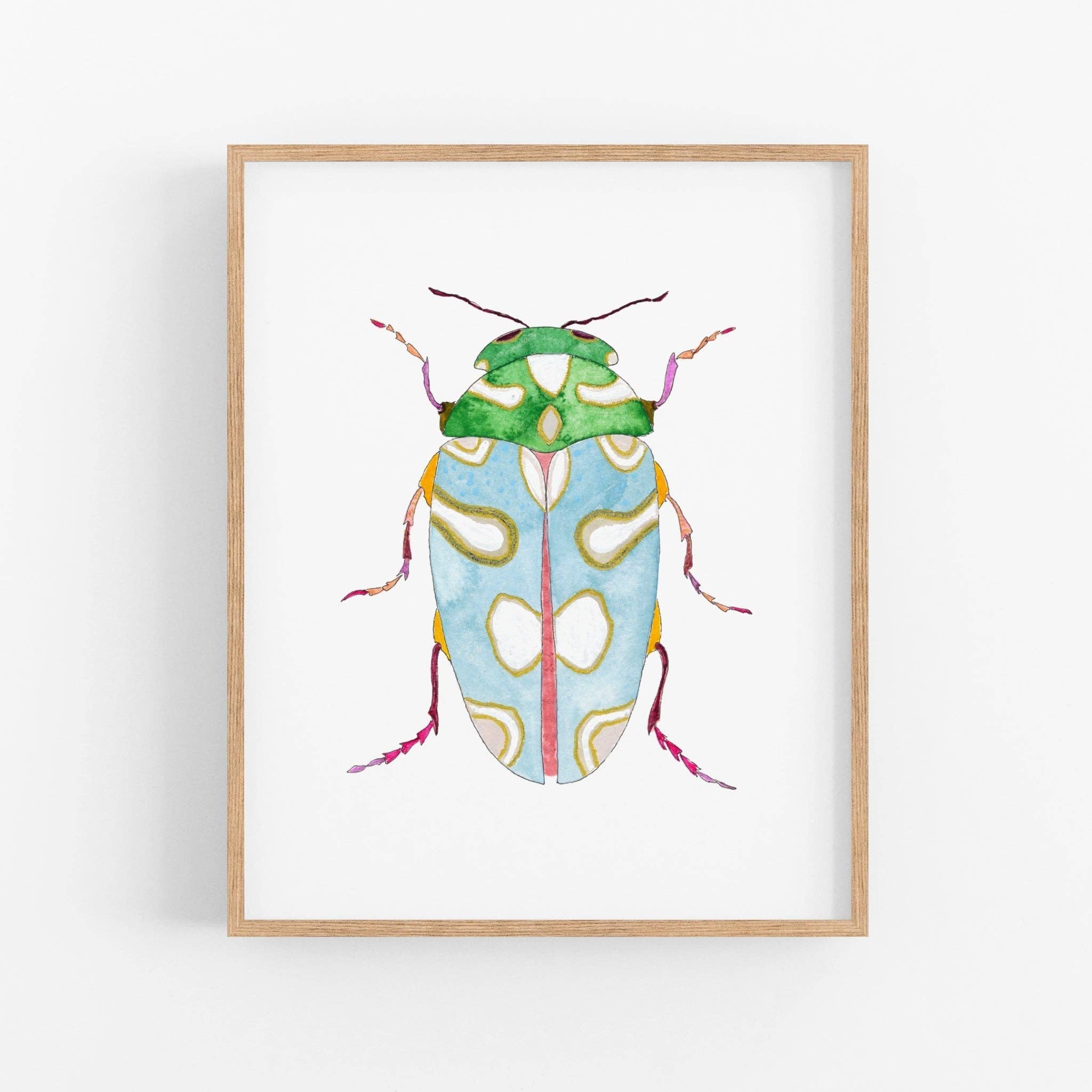 This is an archival fine art print of my original watercolor painting of a blue green beetle, colored from my imagination. Beetles are incredible in real life as well, but I find it so fun to let my imagination go and expand the color palette of nature into my own creations. I've painted over 30 beetles and they go great in a set of 3 or 4 or more.Click here to check out my favorite combo: (3rd and 4th pic here)We offer in-house framing using real oak wood (natural, walnut, or white) or gold metal and all frames come with crystal-clear tempered glass. Framed prints arrive at your door fully framed and ready to hang with all necessary hardware.